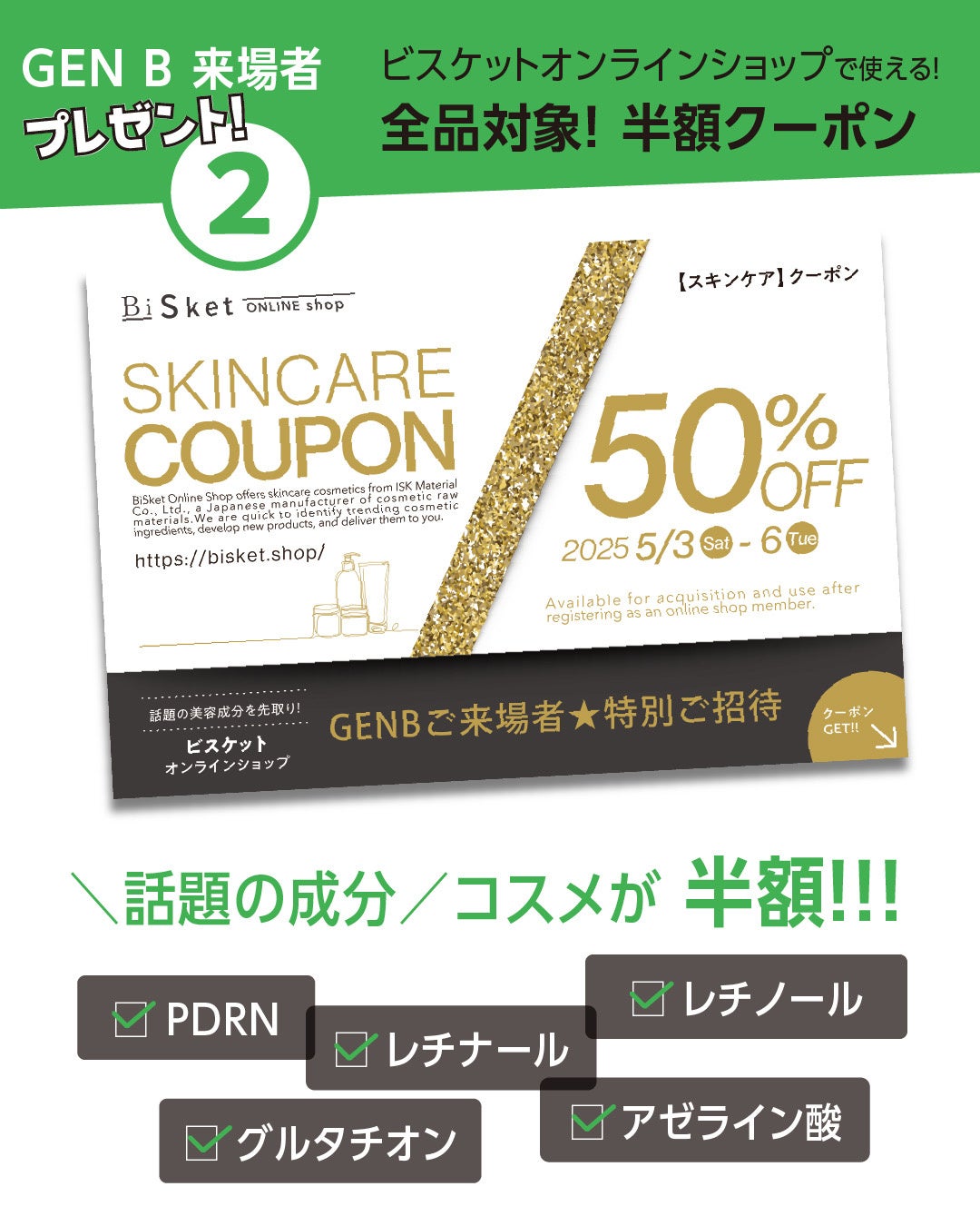 ブースでは、実際に製品を手に取ってお試しいただけるほか、再生医療分野での研究知見に基づくスキンケアアドバイスや、限定販売・特典のご案内も実施予定です。