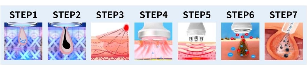 ①温め ②泡パック ➂毛穴吸引 ➃イオンクレンジング ➄RF(ラジオ波) ➅マイクロカレント ⑦EMS ➇冷却 ⑨保湿 |