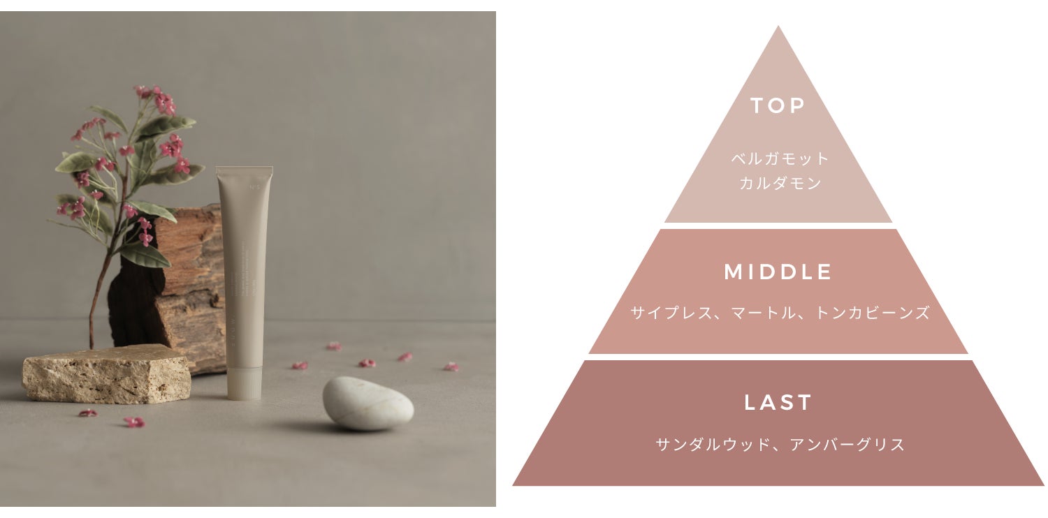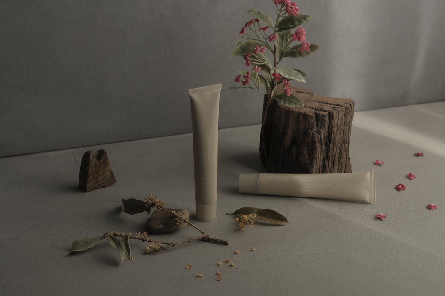 容器には酸化を防ぐアルミチューブを採用し、ベージュカラー×マットな質感の洗練されたパッケージはギフトにもおすすめです。現在展開中のハンドソープと合わせて、植物の香りをまとう癒しのハンドケアをご体感ください。
