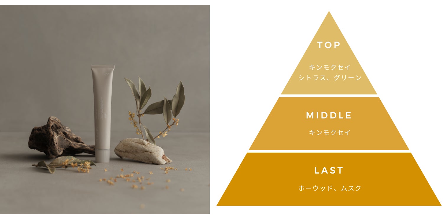 キンモクセイのやさしく広がる甘い香りに、シトラスの爽やかさをひとさじ。街角からふわっと漂ってくるような、どこか懐かしいエモーショナルな香り。