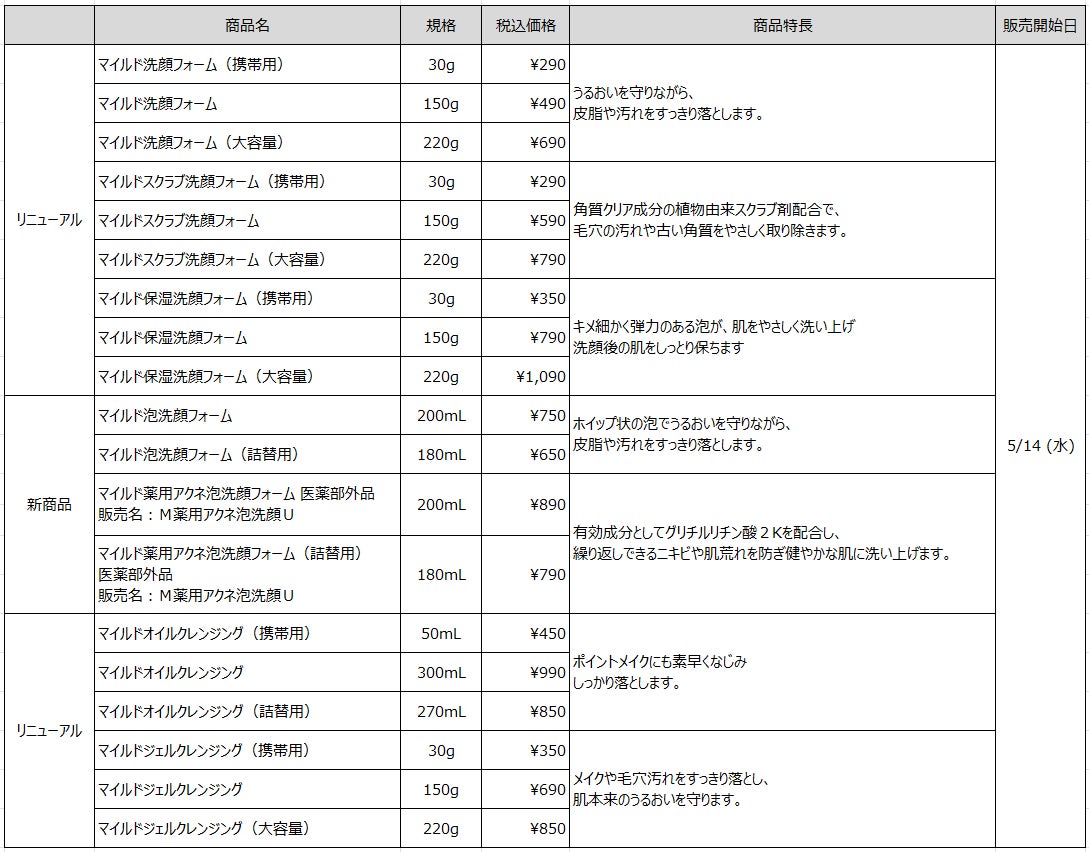 今回は「マイルド洗顔料」シリーズの「マイルド洗顔フォーム」、「マイルドスクラブ洗顔フォーム」、「マイルド保湿洗顔フォーム」の3種、および「マイルドクレンジング」シリーズの「マイルドオイルクレンジング」、「マイルドジェルクレンジング」の2種を、従来の洗浄力や使い心地はそのままに、天然由来成分(*1)100%にリニューアルします。また、ホイップ状の泡をワンプッシュで出せる洗顔フォームとして、「マイルド泡洗顔フォーム」、「マイルド薬用アクネ泡洗顔フォーム」の2種を新たに発売します。