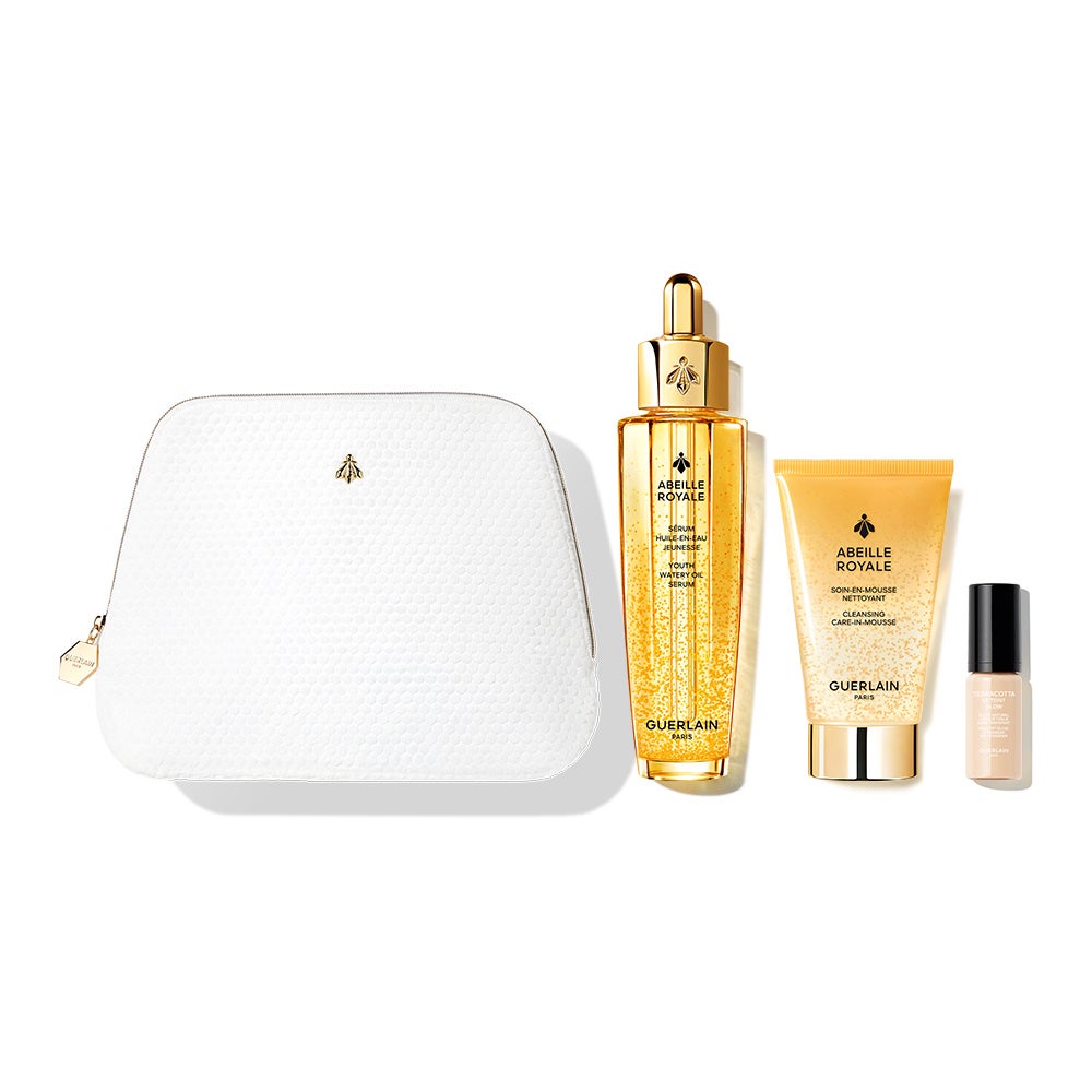 2025年2月に誕生したゲランのアイコン製品〈アベイユ ロイヤル ウォータリー オイル セロム〉をメインに、夏のビューティケアを叶えるスペシャルコフレが登場。肌をケアしながら汚れを優しく落とす洗顔ムースと人気フェイスライン〈テラコッタ フルイド グロウ〉のトライアルサイズ、そしてオリジナルポーチをセット。