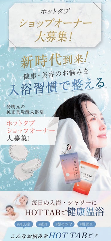 株式会社ホットアルバム炭酸泉タブレット(本社:東京都八王子市、代表取締役:小星 重治、以下「当社」)は、多くの美容家やトップアスリートに支持され、医療現場でも採用される高い健康効果を発揮する純正重炭酸入浴剤『HOT TAB(ホットタブ)』の普及で日本を健康にと、国家的な課題の医療費削減を『国民的なウエルネス運動』にと推進するため、ホットタブの高い健康効果を自ら体験し、自信をもってお客様に勧め『純正重炭酸入浴剤ホッタブの普及を通じ『国民的なウエルネス運動』を推進していただけるアフィリエイト・ショップオーナー(販売店)の募集を開始いたしました。