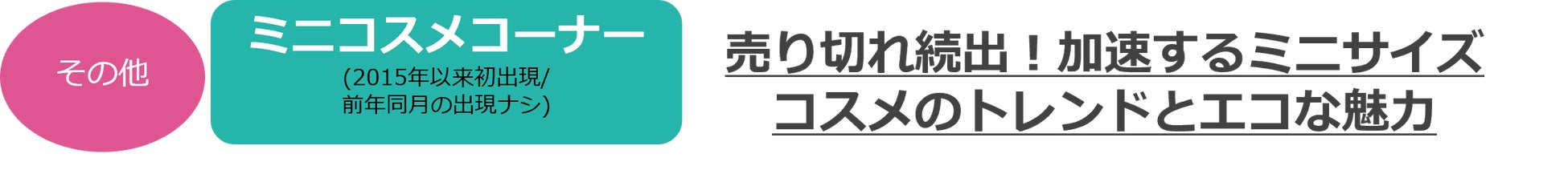 今年3月の@cosme TOKYOリニューアルに合わせミニコスメコーナーが誕生しました。ミニコスメコーナーで購入したアイテムを投稿するクチコミが増加し、早くも話題となっています。実際に売り場では毎日多くのお客様にお立ち寄りいただき売り切れになるアイテムも続出中。売上も、計画に対して約4倍と好調です。最近ではコンビニ限定の韓国ブランドのミニサイズコスメも話題となっています。こうしたミニサイズコスメが人気を集めているのは、小さいバッグにも収まりやすく旅行の持ち歩きにも便利な上に、価格もリーズナブルで気軽に試しやすく、失敗が少ないといったメリットがあることが考えられます。また、購入後使い切れず廃棄することも減るので、エコの観点からも注目されており、需要は今後も続きそうです。