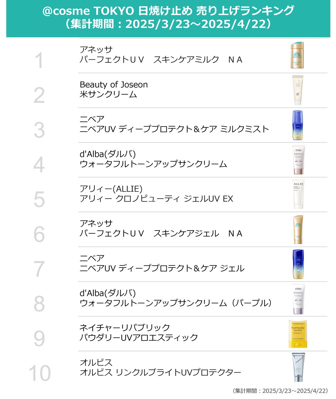 25度越えの夏日が発生するなど暖かい春の訪れを感じさせた4月。昨今ではうっかり日焼けをしてしまいそうな暑い日が突然やってくるということもあって、日焼け止めアイテムへの注目が早くも集まっています。そんな中で、@cosme TOKYOではどのような日焼け止めアイテムが人気だったのでしょうか?売り上げランキングを見てみると、1位に輝いたのは定番人気のアネッサ「パーフェクトUV スキンケアミルク NA」。4月とはいえ、しっかり日差しをガードしたい方々が多くいらっしゃるのかもしれません。続いて、ニベアの新作「ニベアUV ディーププロテクト&ケア ミルクミスト」が2月に発売したばかりにもかかわらず堂々3位に。店頭でポップアップイベントを実施していたことも影響していそうですが、ミルクタイプの日焼け止めがミストとなったという軽い付け心地が話題となっています。ほかにも、本格的な日焼けシーズン前の気軽なUV対策アイテムとして取り入れやすい肌に優しい処方のBeauty of Joseon「米サンクリーム」が2位、下地としても毎年人気なd‘Alba(ダルバ)「ウォータフルトーンアップサンクリーム」シリーズが4位、8位。そして気になったときにささっと塗ることが出来るスティックタイプの日焼け止めネイチャーリパブリック「パウダリーUVアロエスティック」が9位にランクインしています。まだまだ夏本番ではないことや、肌寒さや乾燥も感じさせる春先の今ならではのニーズを感じさせるラインナップとなりました!