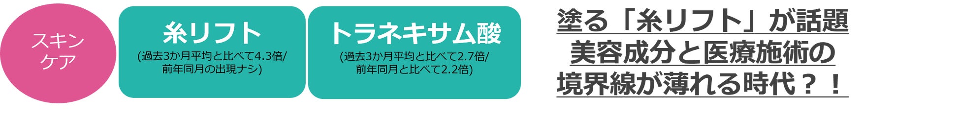 皮膚の弾力性を高めたり、引き締め効果がある成分を配合した美容液などがSNSで「まるで塗る『糸リフト』」と言われ話題となり、クチコミでも当該ワードの出現が増加しました。塗るハイフや塗るボトックスなど美容医療の施術名を想起させるフレーズは今後も要注目です。また春になり日差しが気になり始める季節ということで美白の有効成分『トラネキサム酸』というワードも過去3ヶ月と比較し増加。さらには昨年同月との比較でも増加しています。トラネキサム酸は、美容皮膚科などで処方されるケースも増えていることが推察され、今後ますます身近になり、注目度が高まっていくかもしれません。