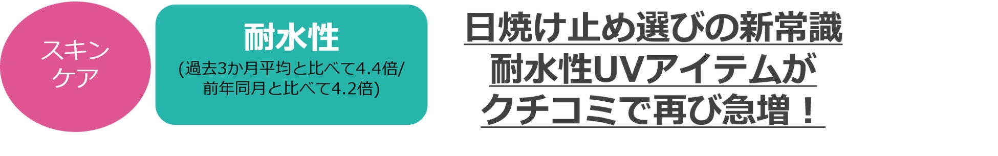 水に濡れても紫外線(UV)カット効果が持続する性能を表す『耐水性』。@cosmeでは昨年5月にも『耐水性』に関するクチコミが前年と比較して4.9倍と大幅に増加しましたが、紫外線が気になる季節になり、今年も昨年引き続き、このワードへの注目が高まっています。昨今の猛暑の影響もあり、UVアイテムの選択時の基準の一つとして、今後さらに重視されていきそうです。