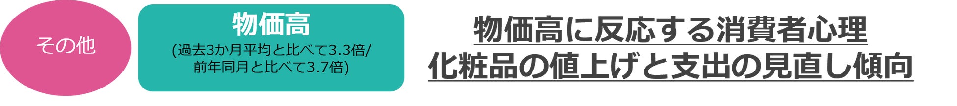 4月には、日用品をはじめとする多くの商品の値上げが話題となり、化粧品も複数の商品で値上げがおこなわれました。前回3月の『トレンドの芽』では、こうした「値上げ」に関するクチコミが増加し、駆け込み需要が発生している状況をご紹介しました。これまでもクチコミで「値上げ」関連のクチコミの増加が見られましたが、最近は「物価高」というワードも目立ってきました。物価高騰が続く中で生活者が化粧品のみならず、支出バランスを総合的に見直し始めている様子がうかがえます。