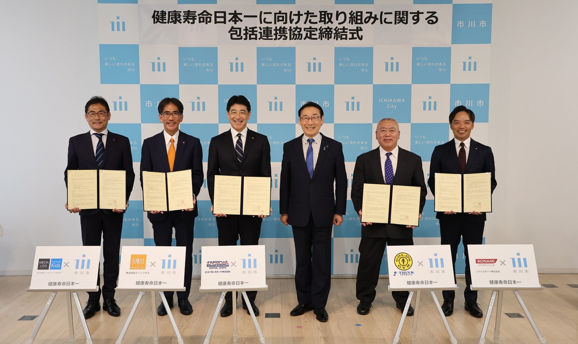 市川市内に「ティップネス南行徳」を展開する当社は、このたび、市民の生活の質の向上、健康寿命の延伸を目的に、同様に市内に施設をもつ野村不動産ライフ&スポーツ株式会社(メガロス)をはじめとするフィットネス事業者4社とともに、健康寿命日本一を目指す市川市と、包括連携協定を締結しました。