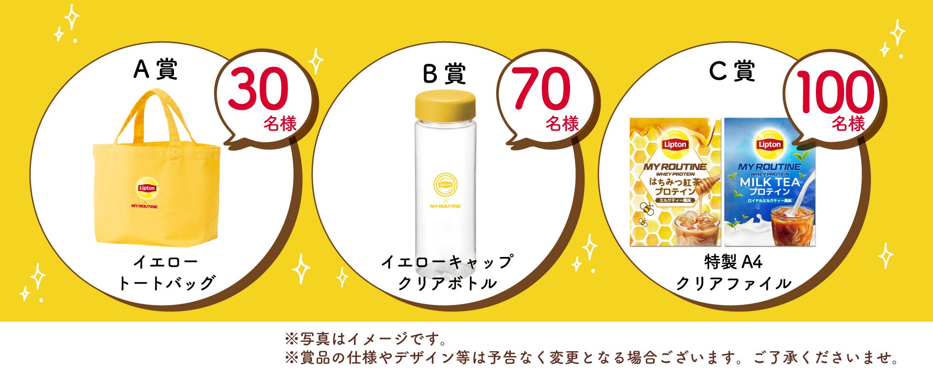(A賞:イエロートートバック30名様/B賞:イエローキャップクリアボトル70名様/C賞:特製A4クリアファイル100名様)