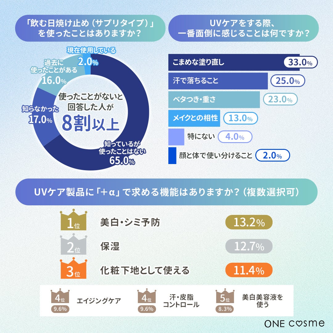 【飲む日焼け止め(サプリタイプ)」を使ったことはありますか?/UVケアをする際、一番面倒に感じることは何ですか?/UVケア製品に「+α」で求める機能はありますか?】