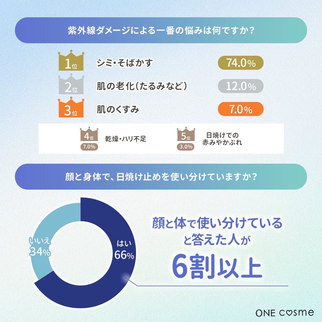 【紫外線ダメージによる一番の悩みは何ですか?/顔と身体で、日焼け止めを使い分けていますか?】
