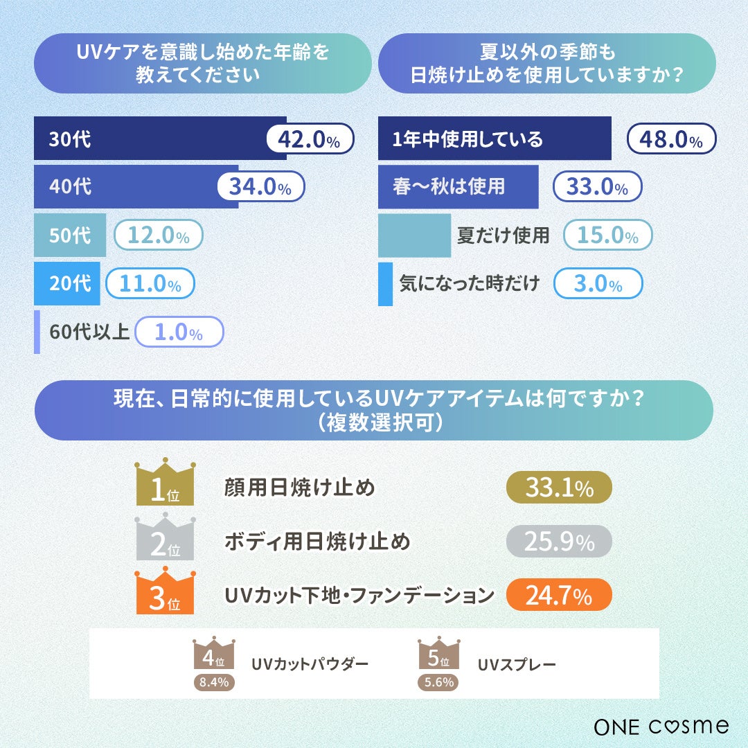 今回の調査から、UVケアは特に20代前半から意識し始める人が多く、若年層においても早期のケア意識が高まっていることがわかりました。