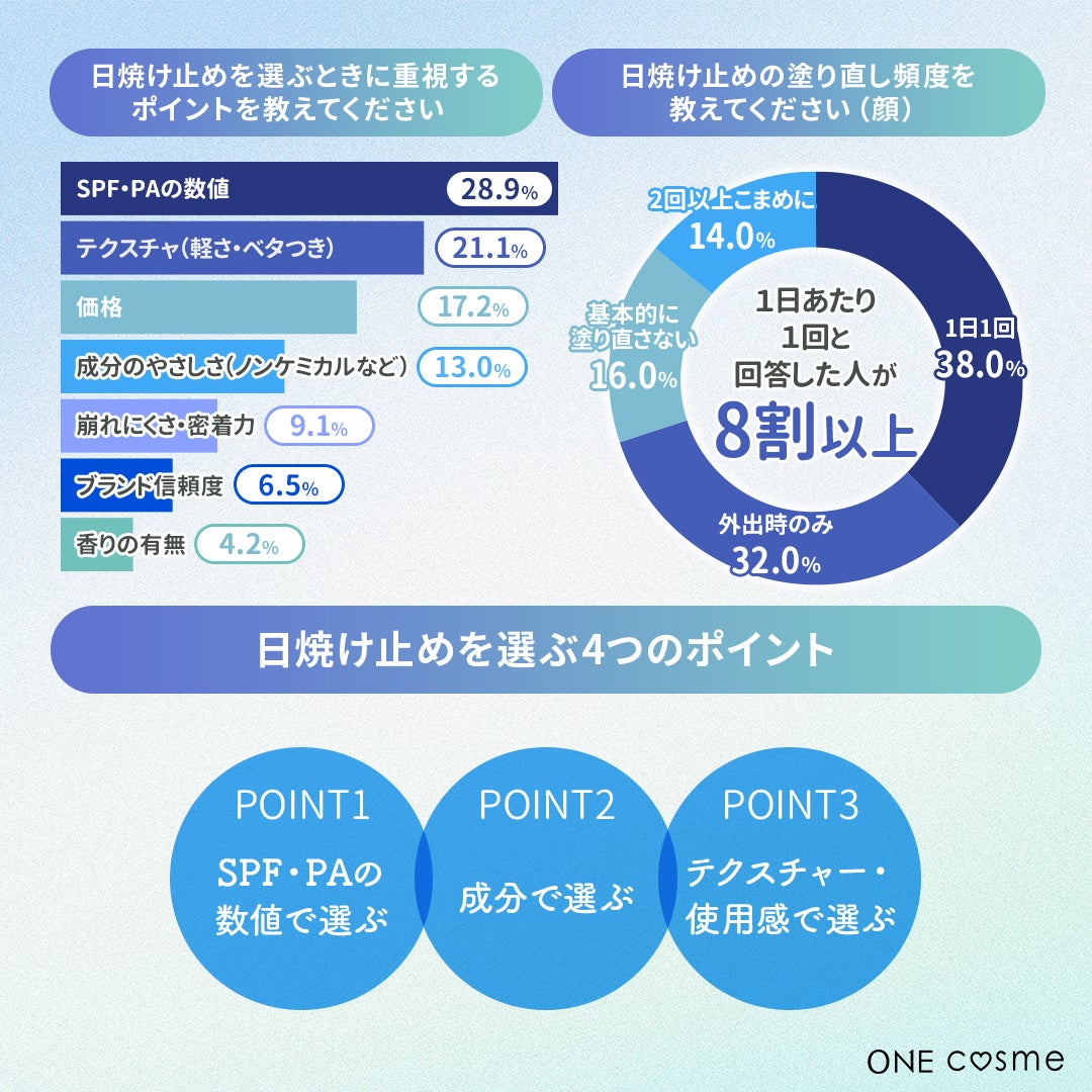 【日焼け止めを選ぶときに重視するポイントを教えてください/日焼け止めの塗り直し頻度を教えてください】