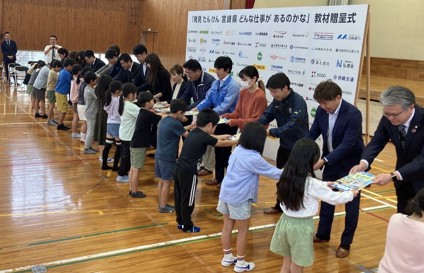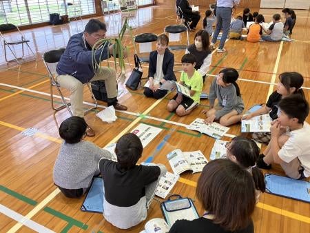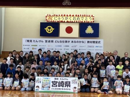 「伝統にんにく卵黄」でおなじみの株式会社健康家族(本社:鹿児島県鹿児島市平之町、代表取締役:藤 朋子)のグループ会社である農業生産法人健康家族は、4月22日に宮崎県西都市立妻南小学校で行われたキャリア教育冊子『発見たんけん宮崎県2025年度版』(K・Pクリエイションズ発行)の贈呈式に参加しました。この冊子は、宮崎県内の小中学生に向けて地元企業の仕事をわかりやすく紹介することを目的に毎年発行されているもので、今回は33社の掲載企業のうち16社が贈呈式に出席しました。当日は、小学4年生64名の児童に対して参加企業によるミニ講話も開催。どんな仕事をしている会社なのか、子どもたちは興味津々でした。