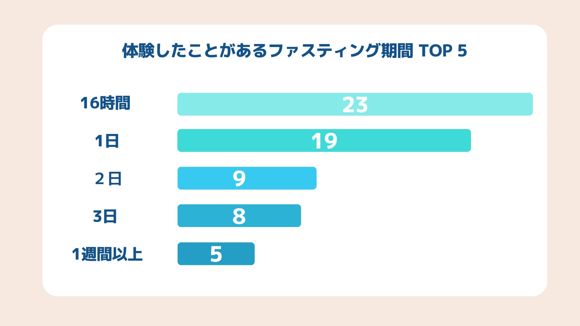 最も多かったのは、16時間ファスティングでした。他のファスティングの期間に比べて短いため、初心者でもチャレンジしやすいのが特徴です。ファスコミでも16時間ファスティングについては詳しく解説しているので、ご興味ある方は次の参考記事もご覧ください。(参考:ファスコミ「16時間断食とは?メリット・デメリットややり方を詳しく解説」)