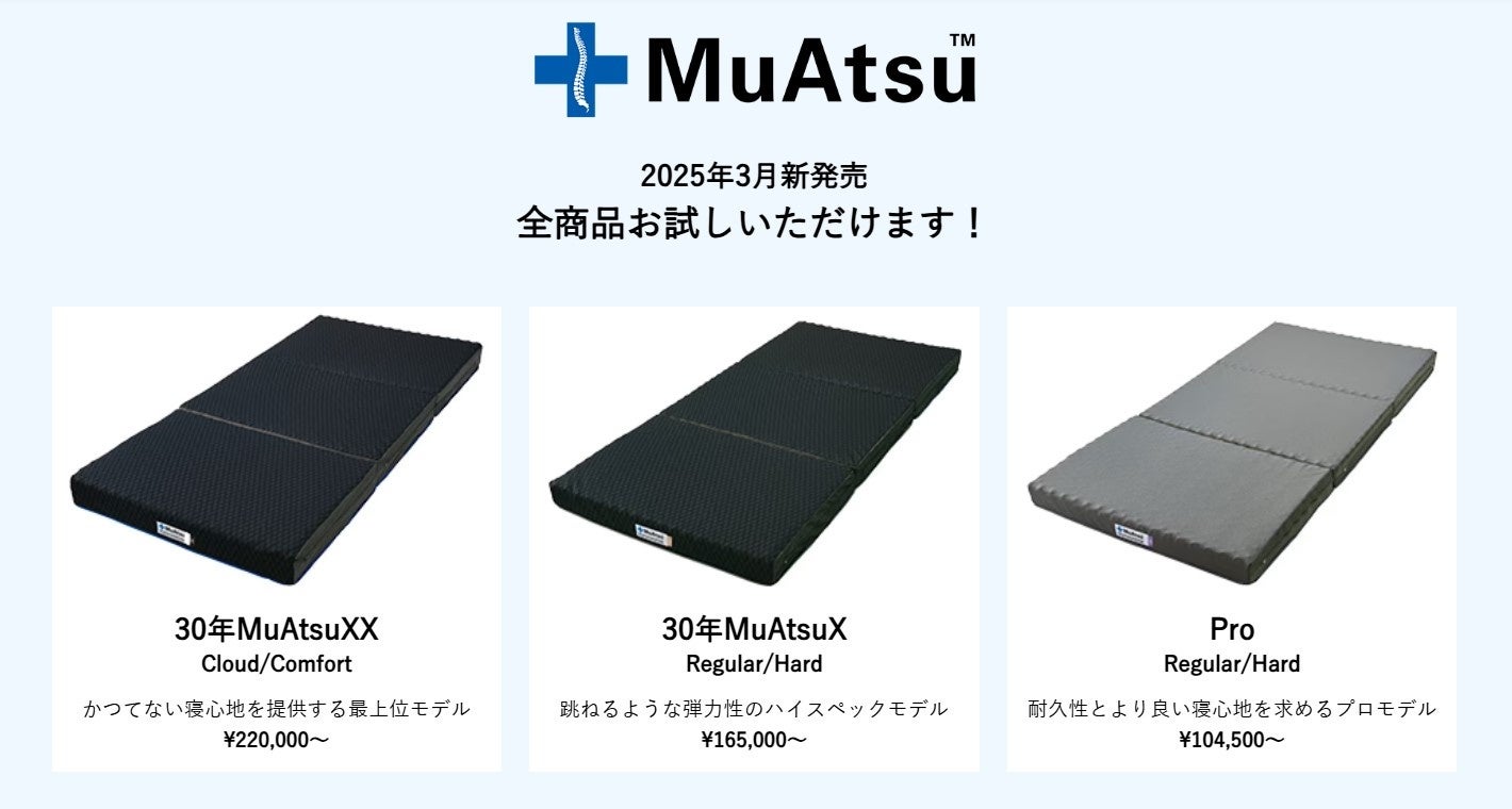 今回は、春から梅雨にかけての快適な睡眠環境をサポートする寝具に加え、2025年3月に登場した注目の新モデル『30年MuAtsu(ムアツ)』を含む、ムアツマットレス全モデルをご用意しております。すべてのモデルは会場にて実際に寝心地をお試しいただけるようになっており、違いを体感しながらお選びいただけます。