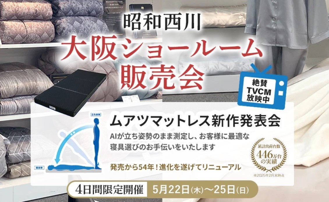 MuAtsu(ムアツ)マットレスを中心に、快適な睡眠環境を提供する昭和西川株式会社(所在地:東京都中央区、代表:西川惠)は5月22日(木)~25日(日)の4日間限定で大阪ショールーム販売会を実施いたします。