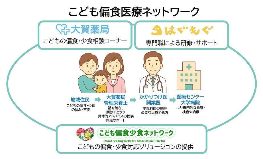 株式会社大賀薬局(本社:福岡市博多区、代表取締役社長:大賀崇浩)は、日本初の新しい医療ネットワーク「こども偏食医療ネットワーク」を、合同会社こども偏食少食ネットワーク協会(本社:大阪府)、NPO法人はぐもぐ(本部:福岡市)と共同で始動します。この取り組みでは、大賀薬局の店舗内に「こどもの食の相談コーナー」を開設し、専門資格を持つ管理栄養士が無料で相談を受付、必要に応じて小児科・小児歯科などの医療機関とも連携する、新たな地域医療ネットワークを構築します。
