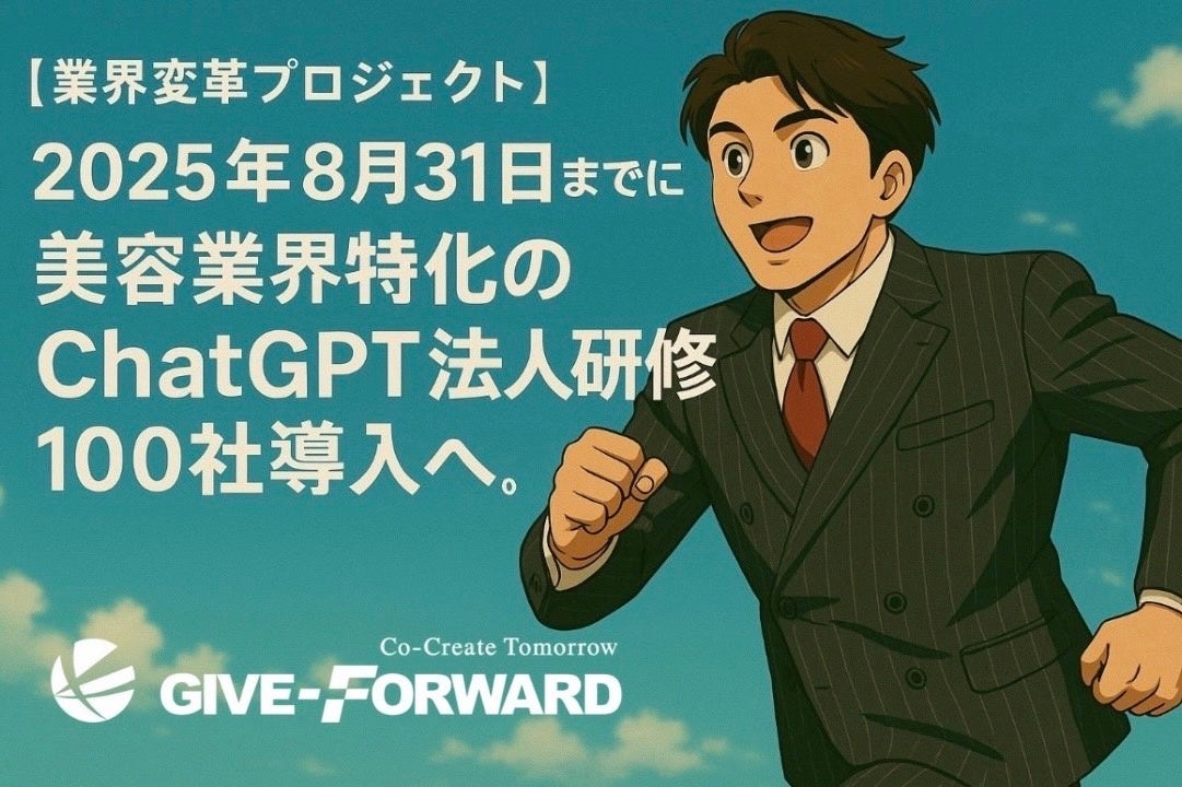 株式会社GIVE-FORWARD(東京都大田区、代表取締役CEO:鈴木啓生)は、2025年8月31日までに美容室・エステサロン・ネイルサロン・アイサロンを中心とした美容業界100社への『ChatGPT法人研修』導入という、業界変革のプロジェクトを始動しました。代表・鈴木啓生を筆頭に、ホットペッパービューティー出身メンバーによる実践知を強みに、『ホットペッパービューティー運用』『ホットペッパービューティーワーク(求人運用)』『SNS集客支援』『業務効率化』『接客品質向上』『スタッフ教育』を生成AI活用で総合支援します。全国対応で、業界の未来を共創いたします。