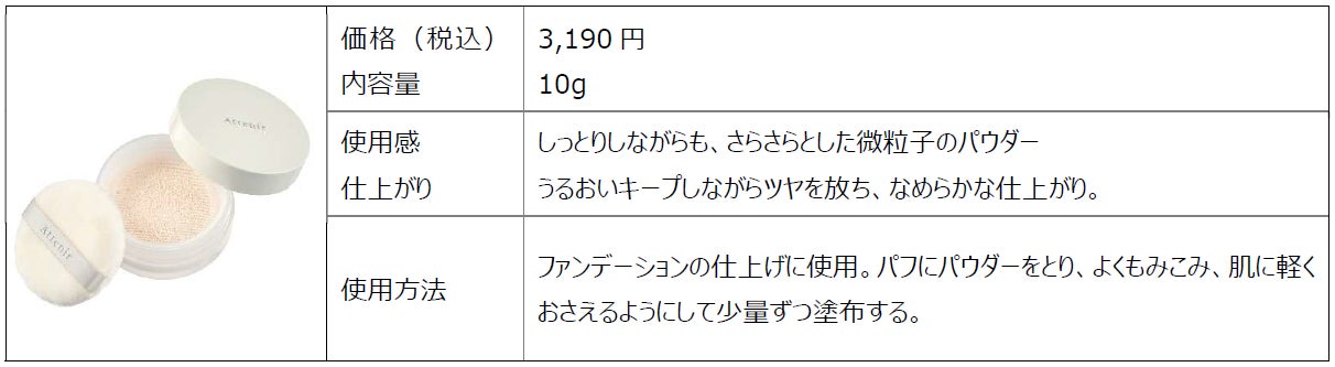 ファンデの生ツヤ感を格上げし、しっとりすべすべの質感で心地よさが続く「オイルコートパウダー設計」、大人の肌をくすませる要因となる“黄ぐすみ”をおさえる「クリアシャインパウダー」、そして血色・ツヤ・輝きを叶える「血色アップパウダー」「真珠パウダー」「ホワイトパール」を配合。塗布した瞬間から、なめらかで極上のすべすべとした仕上がり・そして透明度と輝きを叶えるフェイスパウダーの誕生です。