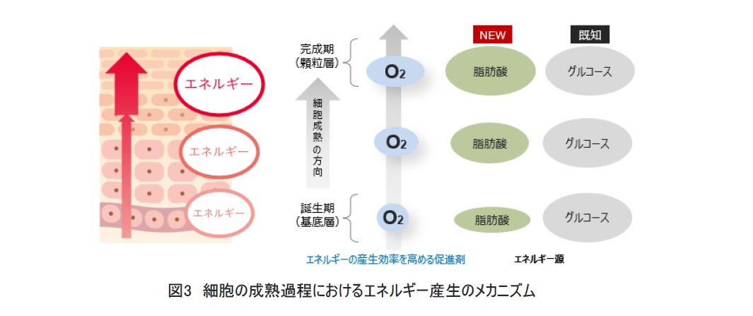 細胞のエネルギー産生メカニズムにまで研究の幅を拡げたことにより、新たな美肌のキーにも迫ることができました。具体的には、細胞の成熟過程においてエネルギー源が変化することを発見し、基底層付近ではグルコースをメインに利用していたのに対し、細胞の完成期*3を迎える顆粒層付近では新たに脂肪酸の利用が高まることが明らかになりました(図3)。