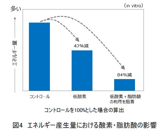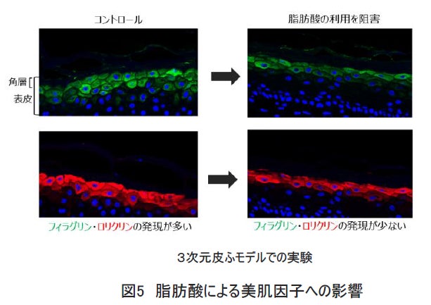 脂肪酸は、酸素を利用したエネルギー産生経路で利用されます。細胞を低酸素にするだけでなく、脂肪酸の利用を阻害すると、エネルギー産生量が大幅に低下することが明らかになりました。また、 細胞成熟に必要な美肌因子の発現にも影響を及ぼすことが確認されました(図4、5)。このため、イプサはエネルギー源としての脂肪酸の活用が、美肌の実現において重要であると考えています。