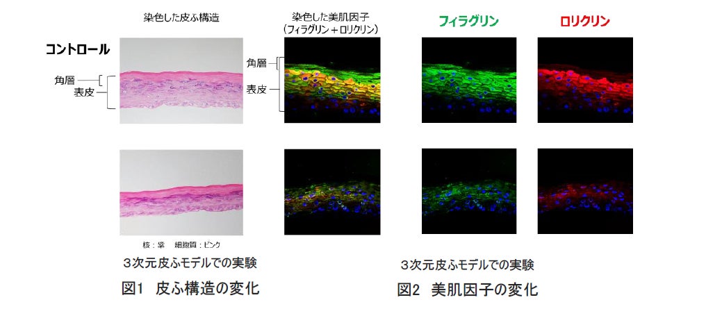 メタボリズムを整えるためには、細胞の成熟過程で絶え間なくエネルギーを供給することが重要であることが明らかになっています。細胞エネルギーと美肌の関連を調べた結果、3D皮膚モデルを用いて細胞エネルギー産生を阻害した場合、健全な表ふ形成だけでなくうるおいやバリア機能の維持に必要なたんぱく質であるフィラグリンとロリクリン*2の発現が減少することが分かりました(図1、図2)。