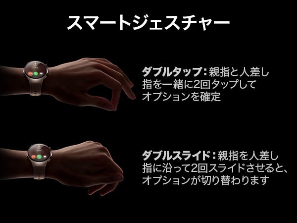 スマートジェスチャーにも対応。設定を有効にすれば、親指を人差し指に沿って2回スライドする「ダブルスライド」や親指で人差し指を素早く2回タップする「ダブルタップ」という動作で電話の応答やアラーム操作などできます。