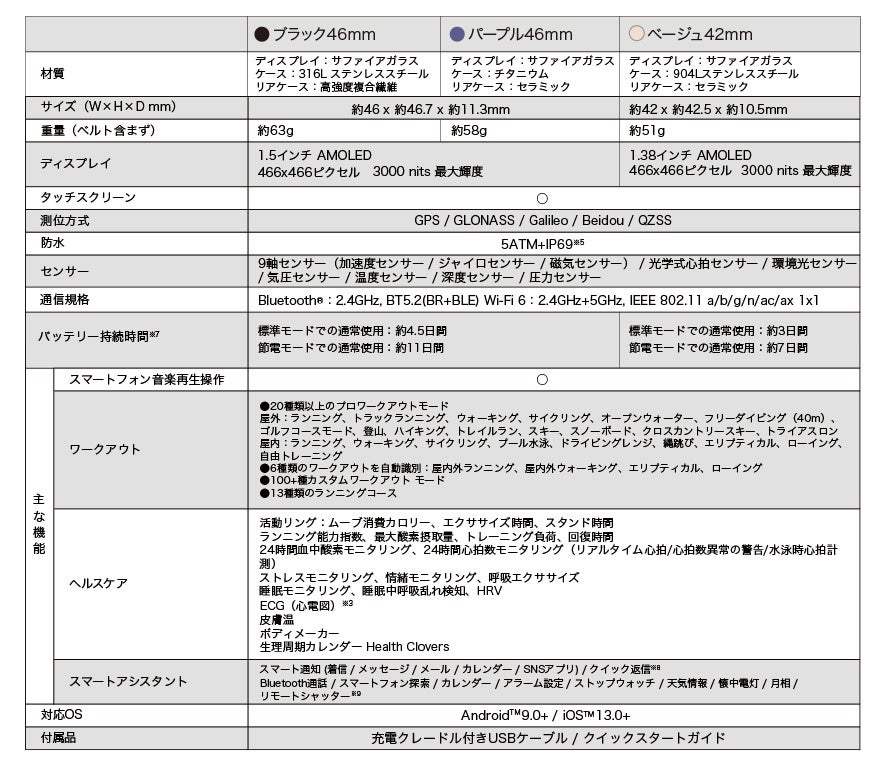 華為技術日本株式会社(ファーウェイ・ジャパン)は、2015年にグローバルでファーウェイ初のスマートウォッチ『HUAWEI WATCH』を出してから10周年の節目にお届けする「HUAWEI WATCH」シリーズの最新モデル『HUAWEI WATCH 5』を、6月3日(火)より発売します。税込の市場想定価格は、46 mmシリーズのブラック(316Lステンレススチールボディ)が71,280円、パープル(チタン合金ボディ)が76,780円、ひとまわり小さな42mmシリーズのベージュ(904Lステンレススチールボディ)が76,780円です。ブラックがフルオロエラストマーベルト、パープルとベージュは、表面に立体織物加工を施したフルオロエラストマーベルトとなっています。
