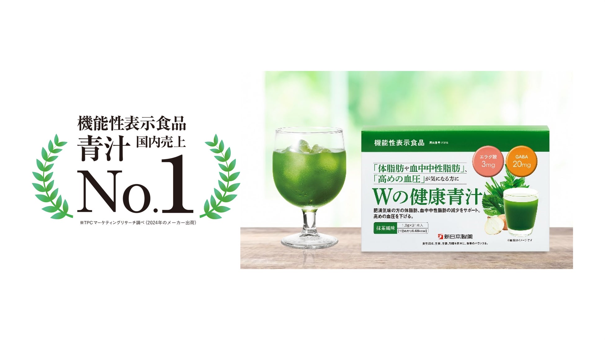 新日本製薬 株式会社(本社:福岡市、代表取締役社長CEO:後藤孝洋)は、「Wの健康青汁」が機能性表示食品の青汁市場において3年連続で国内売上No.1※を獲得したことをお知らせいたします。