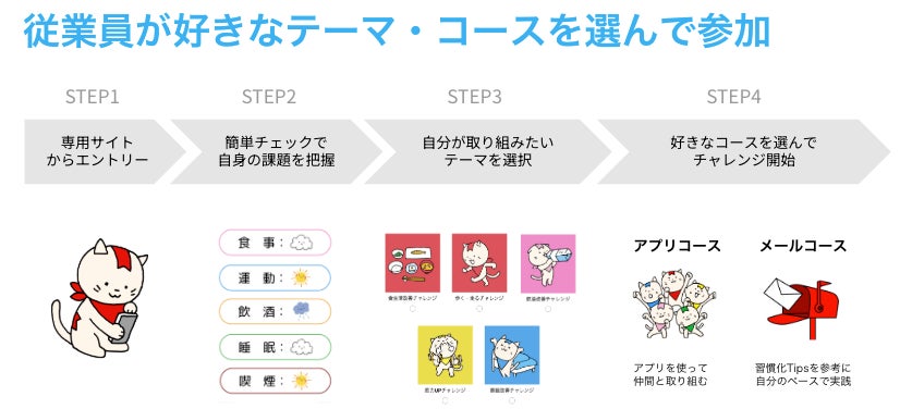 参加者は自分が取り組みたいテーマを選択して、同じテーマを目標に持つ仲間同士5人一組のチームのチャット画面で励ましながら健康習慣を続ける法人向けのプログラムです。食事、運動、睡眠、節酒の生活習慣改善をワンストップで支援します。