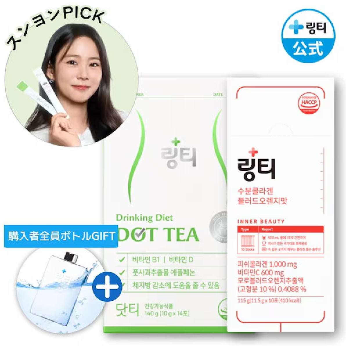 Qoo10で6月に開催されるQoo10メガ割では、スンヨンさんとのコラボ商品の【 LINGTEA × KARAコラボ ♪ 】LINGTEA インナービューティーセット(DOT TEA + 水分コラーゲン + 角型ボトル)を販売いたします。送料が無料になる他、購入者全員にオリジナルボトル・リンティーオリジナル(4フレーバー)お試しセットのプレゼントもご用意しております。