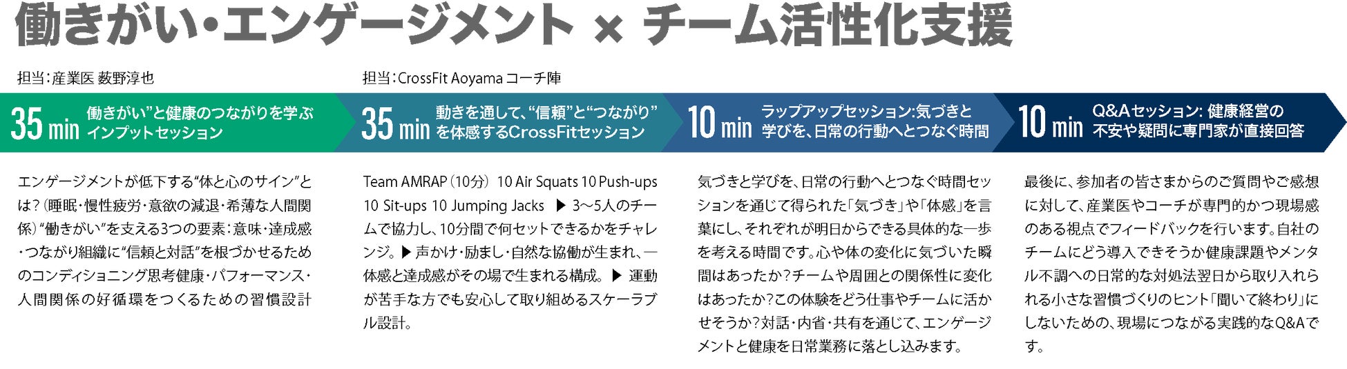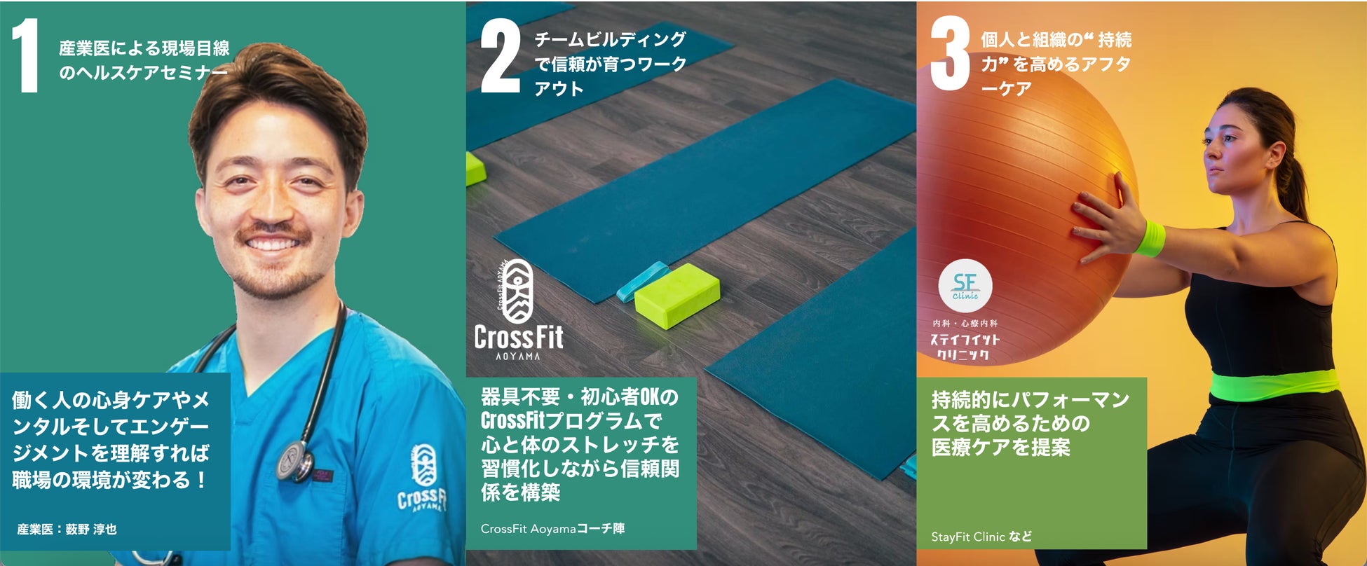WellFitは、産業医薮野淳也監修のセミナーと、指定運動療法施設「CrossFit Aoyama」で行う体験型ワークアウトを組み合わせた“行動変容型”の健康経営支援プログラムです。