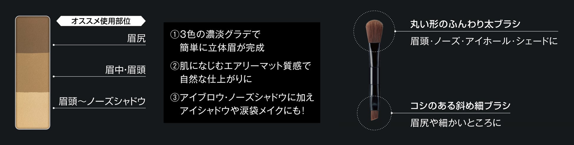 濃淡グラデカラーとエアリーな質感で、ふんわり自然な立体眉に仕上がるパウダーアイブロウ