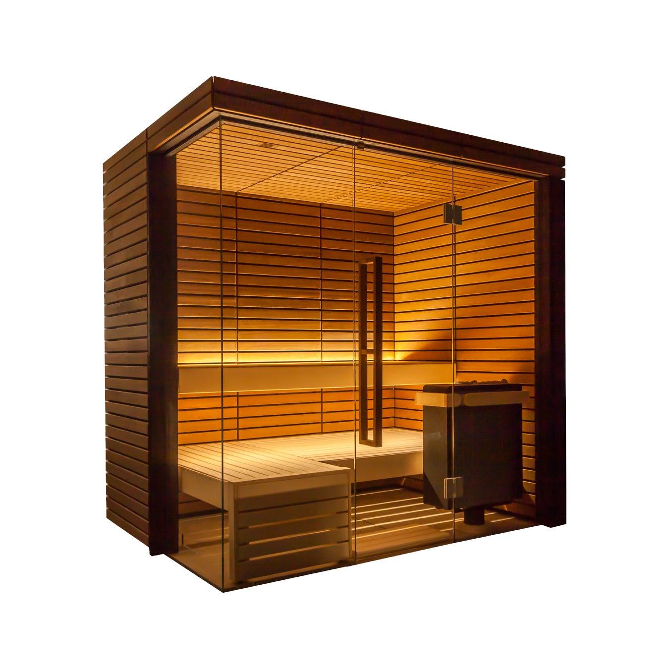 また、大きく二面に取られたガラス面がサウナ室内の窮屈さや圧迫感を解消。間接照明に照らされたサウナ室内がガラス越しに見えることで、サウナのある部屋全体をフォトジェニックに演出します。外装に採用されたサーモライムウッドはシックな色合いと滑らかな質感、そして高い断熱性を有します。ベンチにはライムウッドを採用。濃淡のコントラストで空間を引き立てます。