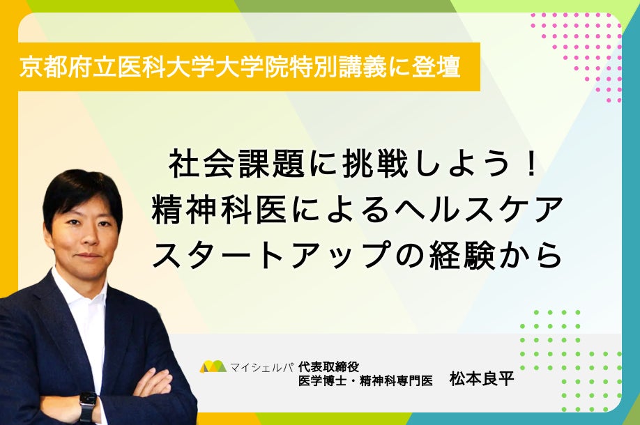 オンラインカウンセリングを提供する株式会社マイシェルパ(以下、当社)代表取締役で、京都府立医科大学 客員教授の松本良平は、6月4日(水)京都府立医科大学大学院特別講義に登壇します。講義テーマは、「社会課題に挑戦しよう!精神科医によるヘルスケアスタートアップの経験から」です。精神科医であり起業家の松本が、医療とビジネスの接点、社会課題解決への道筋について、実体験を基に講義します。