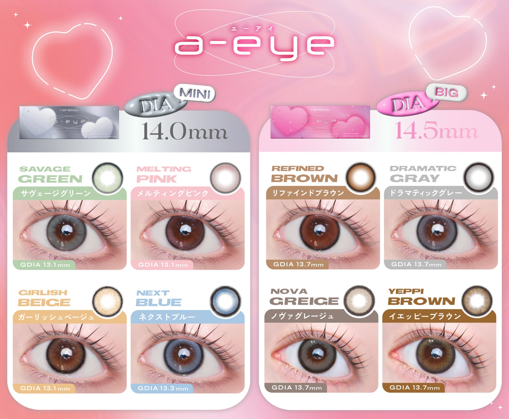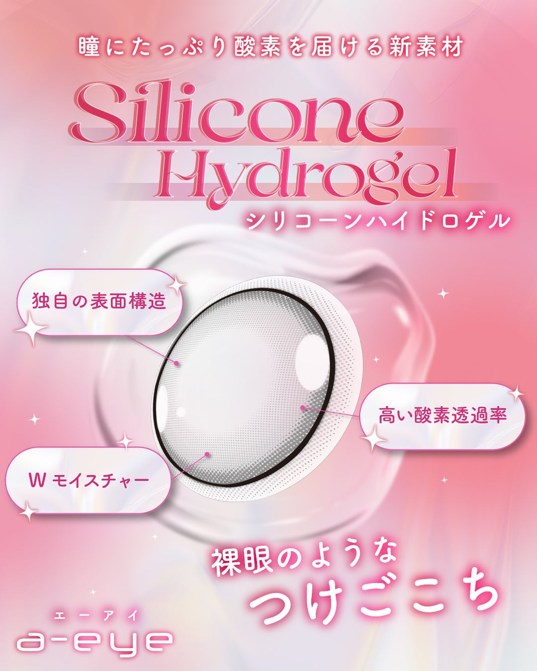 a-eyeは、[Aランク x AIビジュ]をコンセプトに掲げ、 「上級グレードの瞳」と「AI級ビジュアル」を実現するよう作られたカラーコンタクトレンズブランドです。かわいくなれることはもちろん、瞳への優しさ、快適さを両立したシリコーン素材を採用しています。