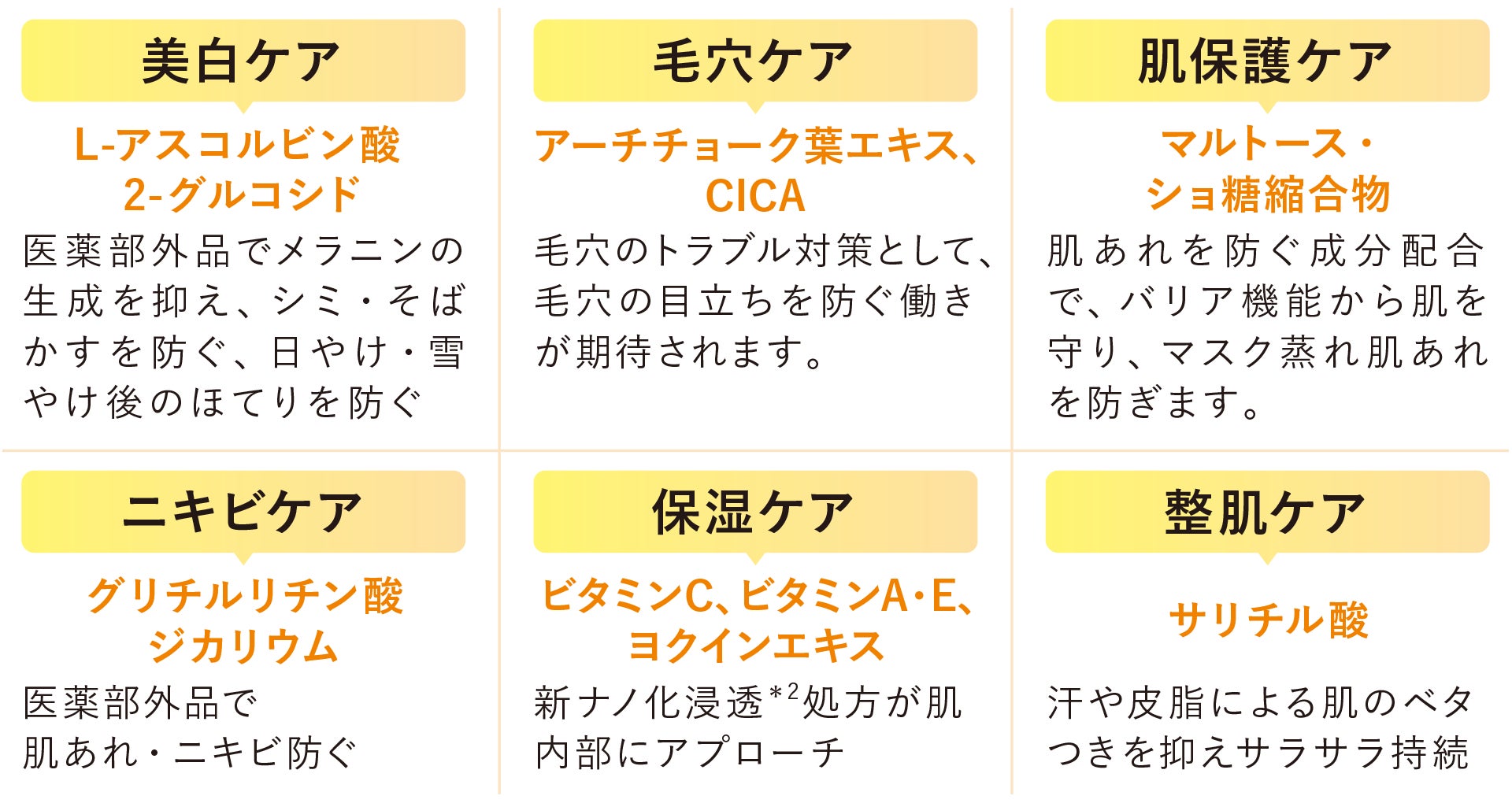 「速攻型・保湿型・持続型・浸透型・多機能型」の5つのアプローチで、キメ・毛穴・くすみ※3にしっかり働きかけます。新感触のジェルがスキンケア効果をさらに高めます。