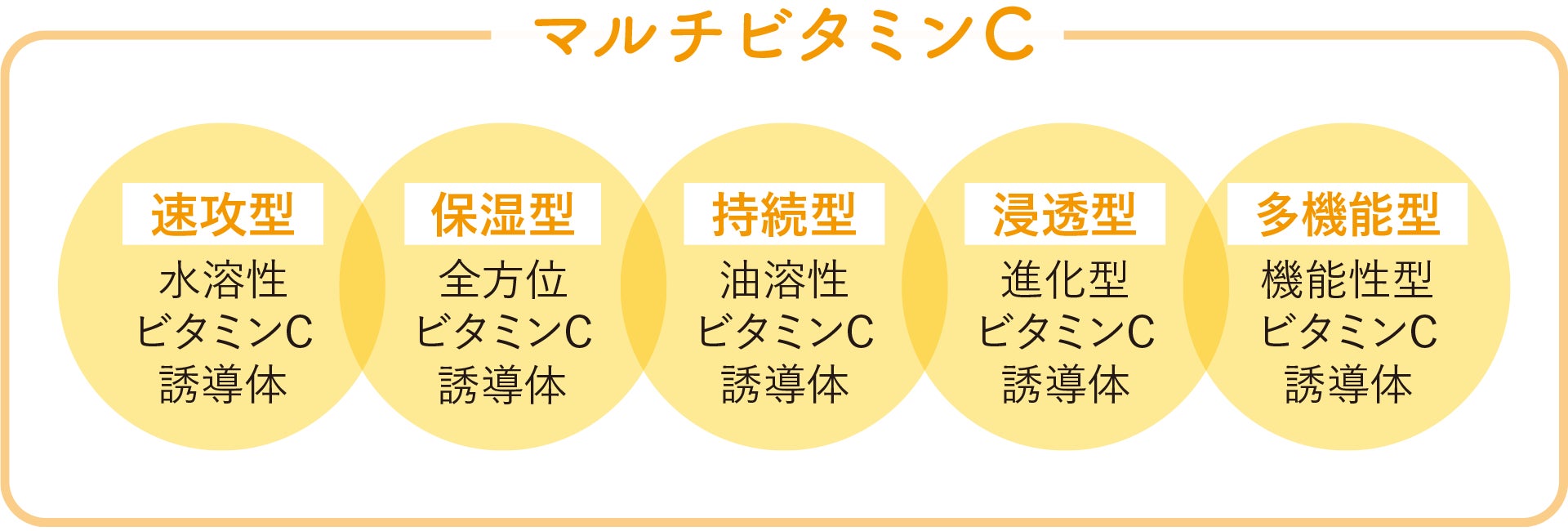 ・5種類のビタミンC誘導体(L・アスコルビン酸 2.グルコシド、テトラ2、ヘキシルデカン酸アスコルビル、 30・エチルアスコルビン酸、ジパルミチン酸アスコルビル、dl、a、トコフェロール 2・L・アスコルビン酸りン酸ジエステルカリウム塩)を配合した独自技術に成功しました。