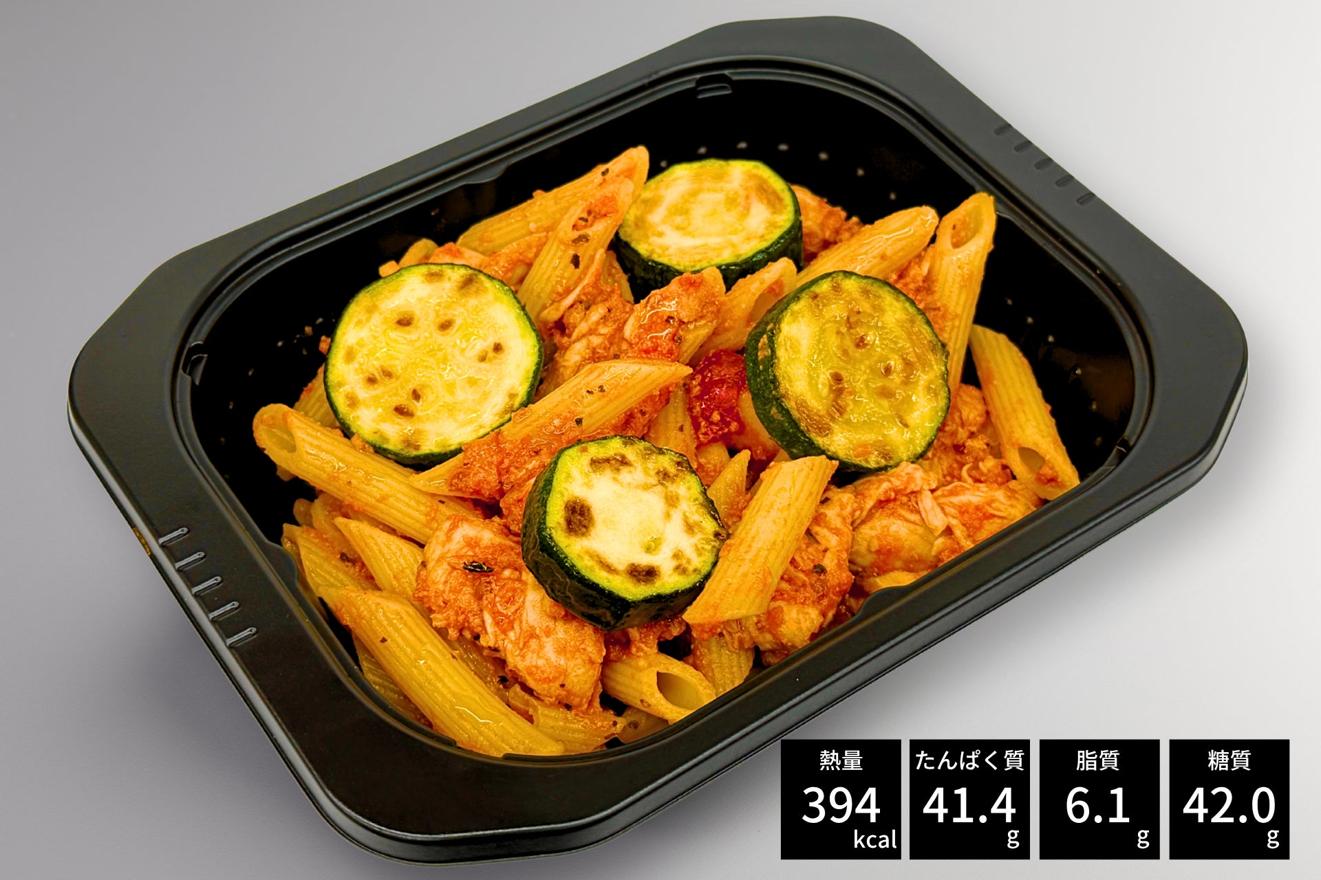 柔らかな鶏ささみとゴロっと大きくカットされたズッキーニ、もっちりとした食感が楽しめるペンネにピリ辛サルサソースが絡んだ、ヘルシーながら食べ応え抜群の1食に仕上げました。満足感が得られやすく食べ過ぎを防げることから、ペンネという形状を採用しています。