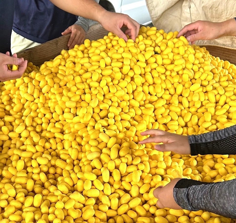 光沢のある鮮やかな黄金色(山吹色)の繭が特長の『ぐんま黄金』という品種の