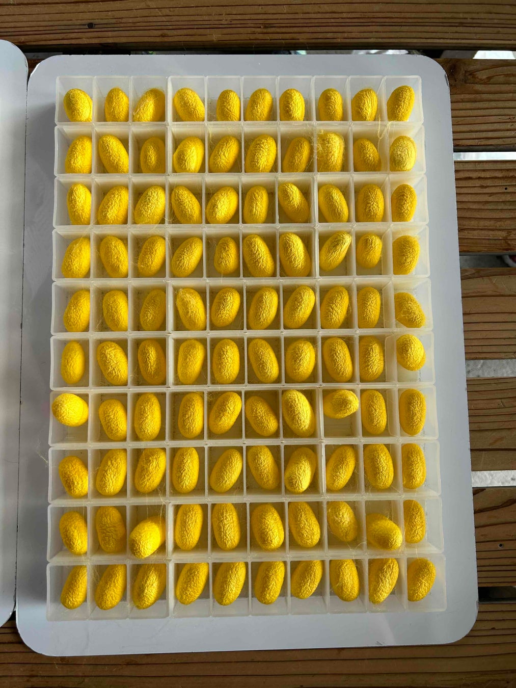 蚕の品種の中には、同じ桑を食べても白繭をつくる蚕と、黄色の繭をつくる蚕がいます。