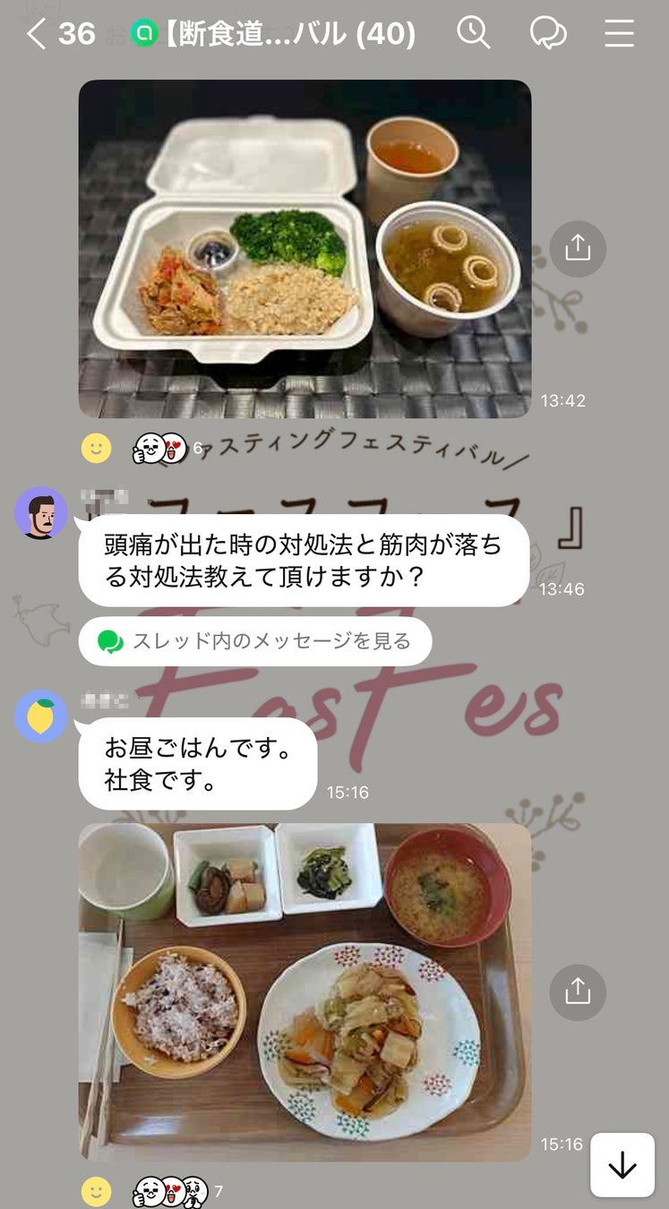 ファスフェス中はLINEオープンチャットを活用し、参加者同士が食事内容や体調の変化を共有。仲間の投稿を見ることでモチベーションを保ち、励まし合いながら取り組める雰囲気が自然と生まれていました。