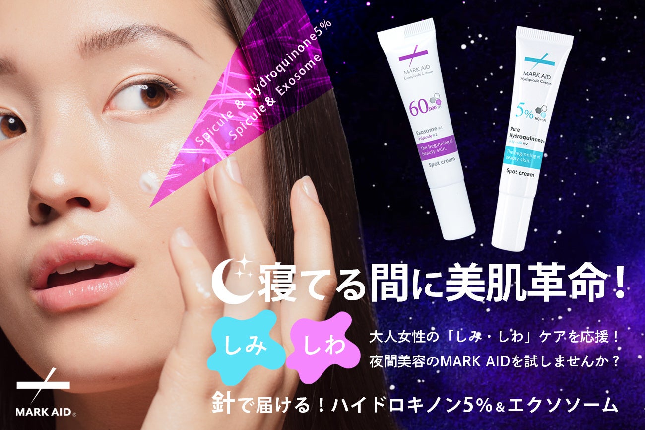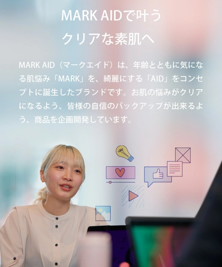 「MARK AID」(マークエイド)ブランドの素晴らしさを多くの方に知ってほしい。 マークエイドは、お肌のお悩みに特化したスキンケア化粧品ブランドです。 寝る前にピンポイントケアするだけ!寝ている間に綺麗になれる! お肌が喜ぶ「夜間美容」をご体感ください。