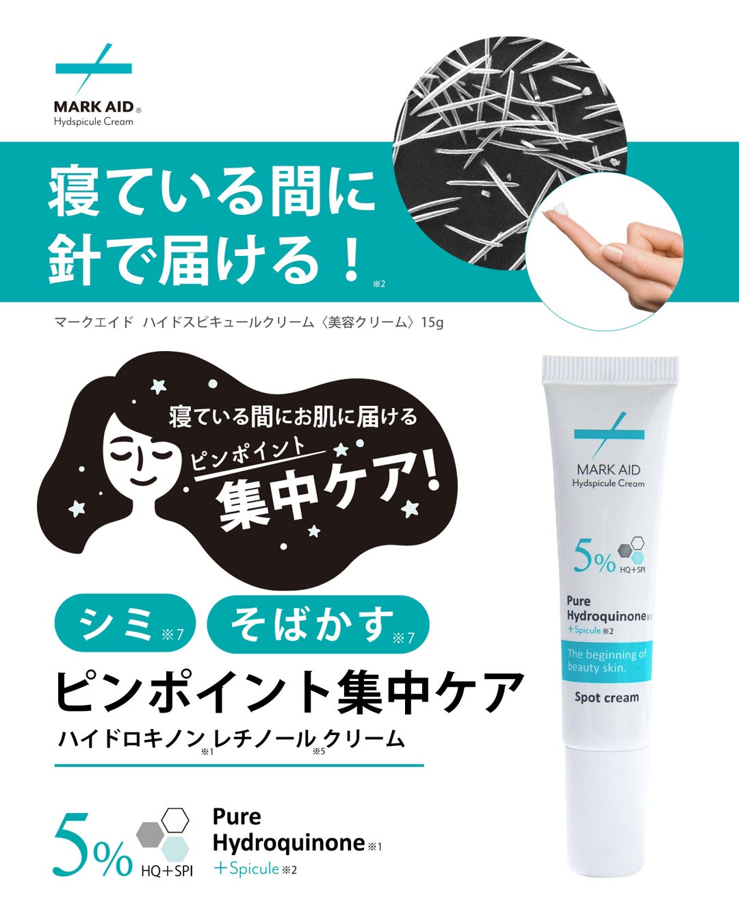 ハイドロキノン※1は、気になる肌くすみなどのピンポイントケアが期待できる成分です。 塗布することで気になる一点に素早くアプローチ。キメの整った白肌を目指せます。 マークエイド ハイドスピキュールクリームは、純ハイドロキノンを5%配合※1、素早く悩みに答えます。