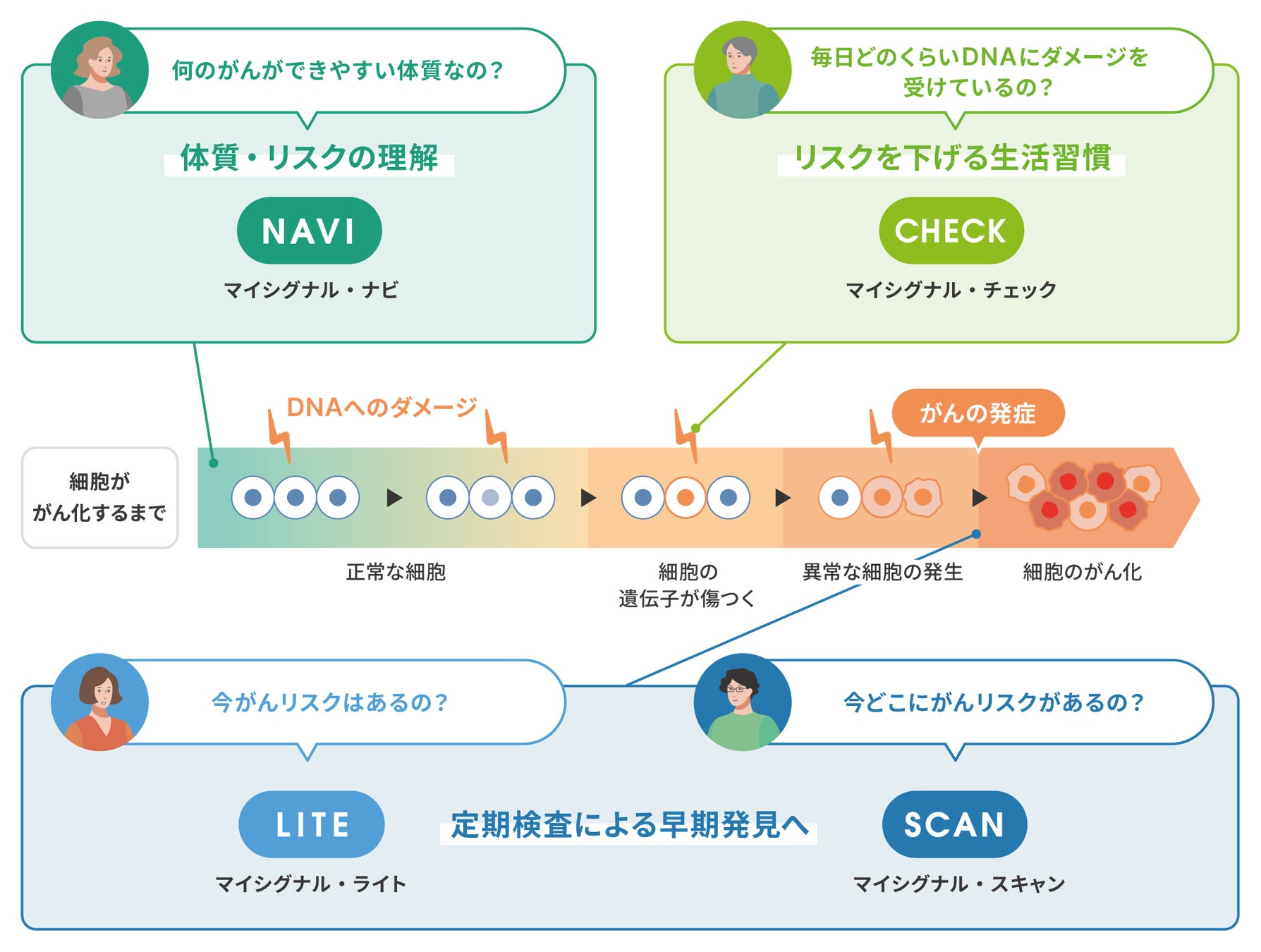 「マイシグナルシリーズ」は、予防と早期発見につなげる、がんリスク検査です。このシリーズはマイクロRNA×AIでがんリスクを高精度に評価する検査「マイシグナル・スキャン」、より手軽にがんリスクを評価する検査「マイシグナル・ライト」、がんに特化した遺伝子検査「マイシグナル・ナビ」、DNAダメージをモニタリング・予防につなげる検査「マイシグナル・チェック」で構成されています。どの検査も尿やだ液を採取するだけで、体に負担なく検査することが可能です。4つの検査を通じて、自らの体質的なリスクを知り、日々のDNAのダメージをモニタリングすることで発症予防をサポート。それでも防ぎきれないがんを早期発見することを一気通貫でサポートし、がんの予防と早期発見を促進することを目指した包括的ながん対策です。