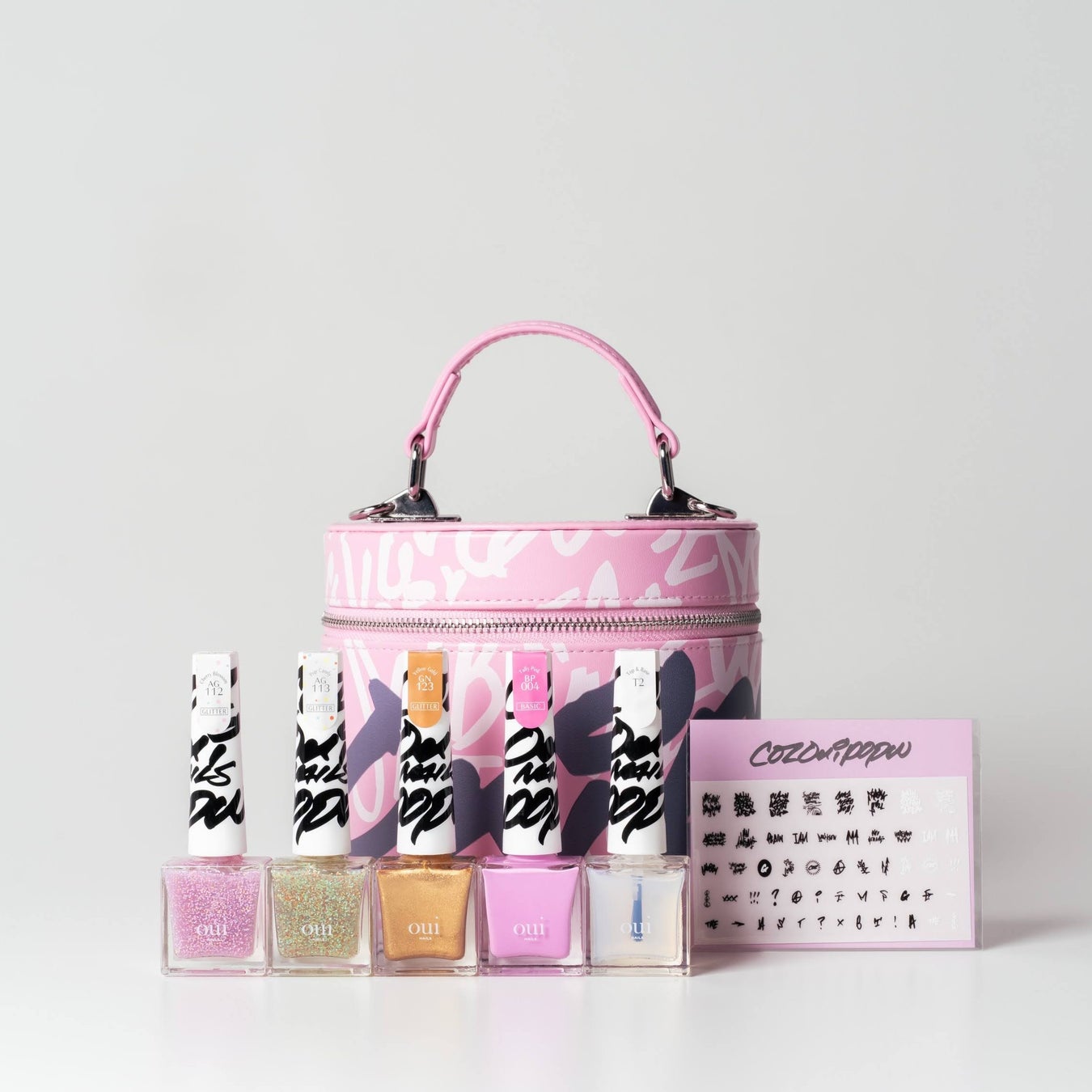COZがファッション視点でセレクトした2種のカラーセットは、 指先に纏うだけでスタイリングを格上げし、トレンドと日常使いのバランスも抜群。それぞれのセットは、内田氏によるグラフィティアートが大胆に施されたバニティバッグとともに、 今だけの限定アイテムとして登場します。