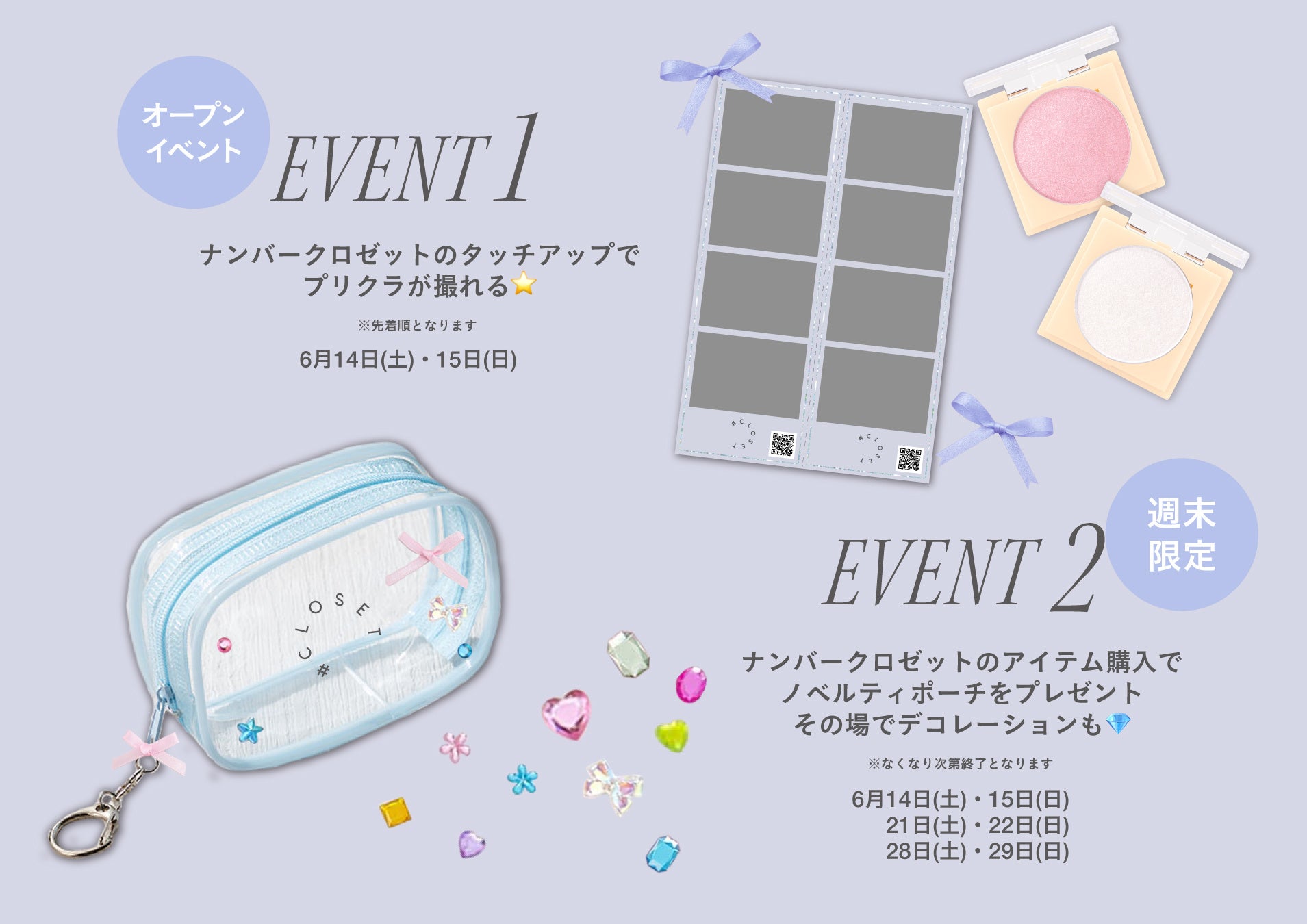 オープンイベントとしては6月14日(土)・15日(日)の二日間限定でナンバークロゼットをお試しいただくとその場でプリクラが撮影できたり、6月14-30日までの土日限定(6日間)で、ナンバークロゼットのアイテムを1点以上ご購入頂いた方にノベルティポーチを1個プレゼント!またその場で商品にデコレーションできるスペシャル体験もご用意してります。