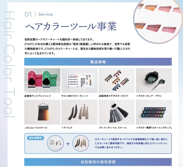 株式会社スタッフスは1975年に設立され、尾張の地で織物と色物染めの伝統を継承したいという想いのもと、「イロドリある未来をつくる」ためにヘアカラーチャートの製造販売事業を続けてまいりました。